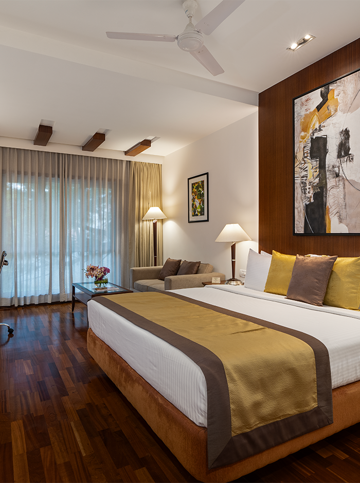The Club Room reveals enchanting garden vistas from its serene private sit-out area. The accommodation balances the spaciousness and luxury of a suite with the comforts room